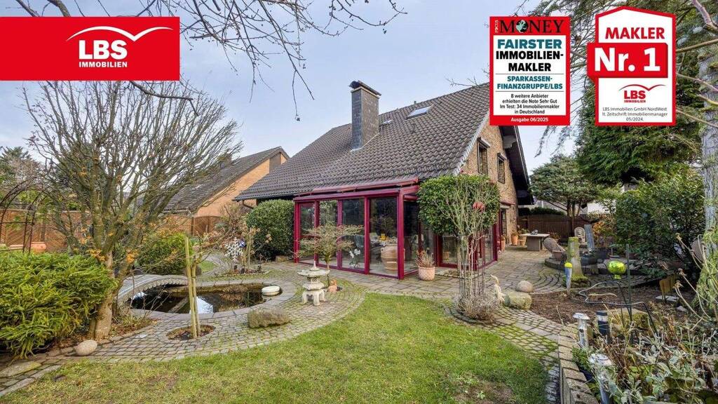 Der Garten und die Terrasse sind nach Nord/West ausgerichtet. Der Garten ist unterbrochen durch abgesetzte Beete, aufwendig gepflasterte Bereiche, einen kleinen Teich mittig im Garten und einen Pavillion an Rande des Gartens. Auch eine elektrisch bedienbare Markise über der Terrasse bietet im Hochsommer hinreichend Schutz vor Sonneneinstrahlung.