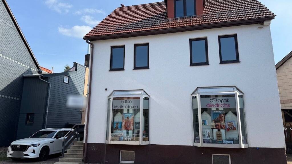 Das gepflegte Anwesen ist mit einem Wohn- und Geschäftshaus und einer Scheune mit Garage bebaut. Das Objekt wird derzeit noch von den Eigentümern bewohnt und ist im Erdgeschoss mit einer vermieteten Ladeneinheit belegt. Das Wohnhaus besitzt eine Dreizimmerwohnung über zwei Etagen. Das 1. Obergeschoss ist aufgeteilt in Flur, offenem Wohn- und Esszimmer mit Kachelofen, Küche mit Essbereich und einem Tageslichtbad mit Badewanne, Waschbecken und WC. Das ausgebaute Dachgeschoss bietet nochmal zwei Schlafzimmer, ein Duschbad und einen Abstellraum. Das vermietete Erdgeschoss beherbergt ein Geschäft/Ladenlokal mit Verkaufsraum, Teeküche/Werkstatt und einem Wannenbad. Das Haus ist zudem unterkellert. Diesen nutzen ausschließlich die Eigentümer für sich selbst.