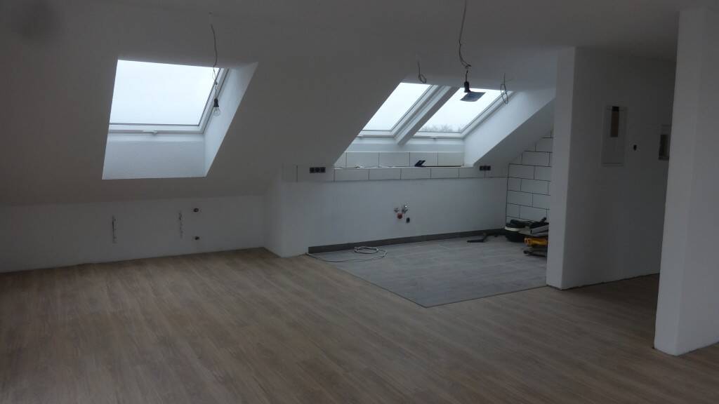 Die Wohnung hat zwei Schlafzimmer, ein Wohn-/Esszimmer mit offener Küche (Einbauküche vorhanden) und ein Tageslichtbad mit Dusche. Auf den Bildern ist leider die Einbauküche nicht zu sehen, da die Küche später eingebaut wurde. Die Wohnung ist komplett mit Fußböden ausgestattet. Die Dachterrasse zur alleinigen Nutzung befindet sich im Obergeschoss über der Garage.
