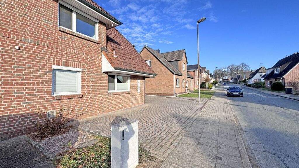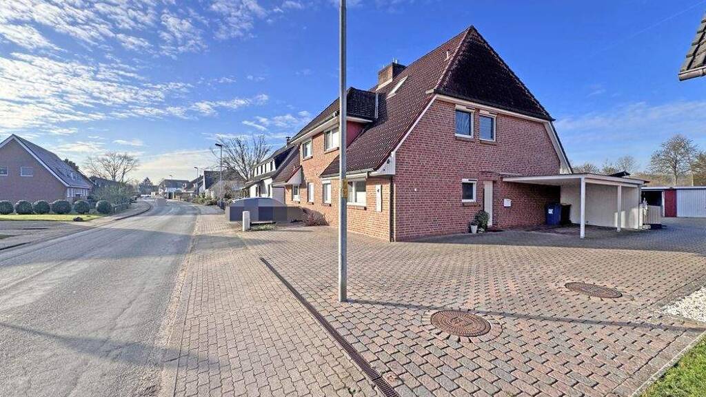 Über eine geschmackvoll gepflasterte Zufahrt gelangt man zu den Stellplätzen und dem an der Giebelseite an das Haus angebauten Carport. Der ebenfalls an der Giebelseite befindliche Eingangsbereich ist überdacht und gewährt den Zugang zur zentralen Diele im Erdgeschoss. Hier sind ein Duschbad, die modern gestaltete Küche, der Hauswirtschaftstraum mit neuwertiger Gas-Brennwerttherme sowie der großzügige Wohn-Essbereich mit Glaserker in den Garten untergebracht. Vom Wohnbereich besteht direkter Zugang auf die kürzlich erneuerte und eingefriedete Terrasse an welcher der nach Westen ausgerichtete Garten anschließt.