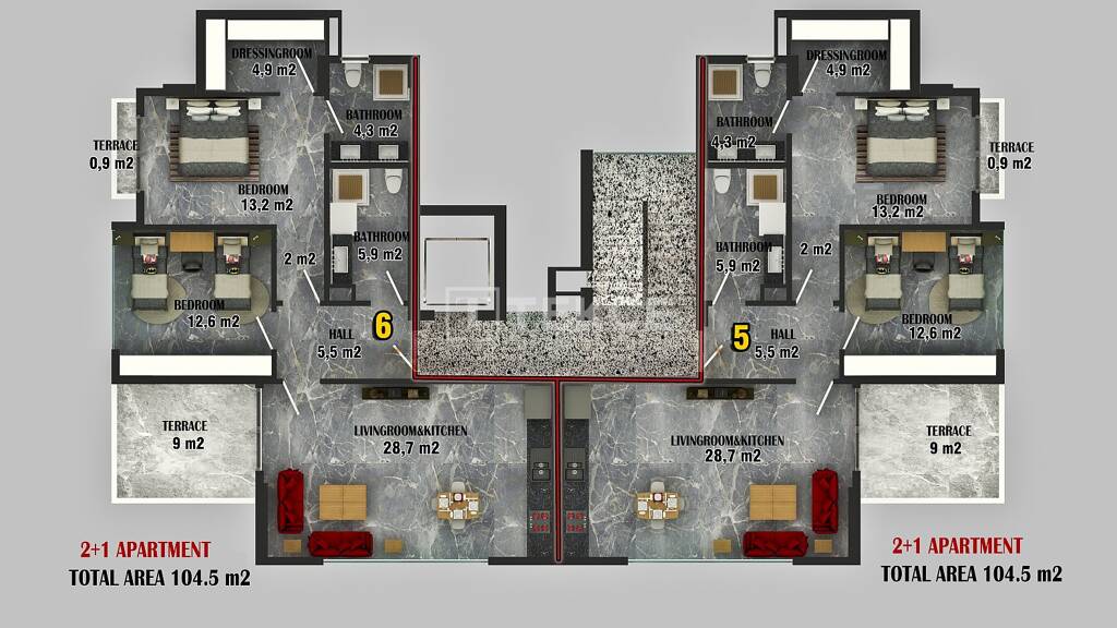 Das Projekt mit 2 Blöcken und 36 Wohnungen verfügt über Innen- und Außenpools, einen Fitnessraum, ein Türkisches Bad, eine Sauna, einen Massageraum, einen Whirlpool, ein Dampfbad, einen Raum für Unterhaltung, Überwachungskameras und einen 24/7-Sicherheitsdienst.