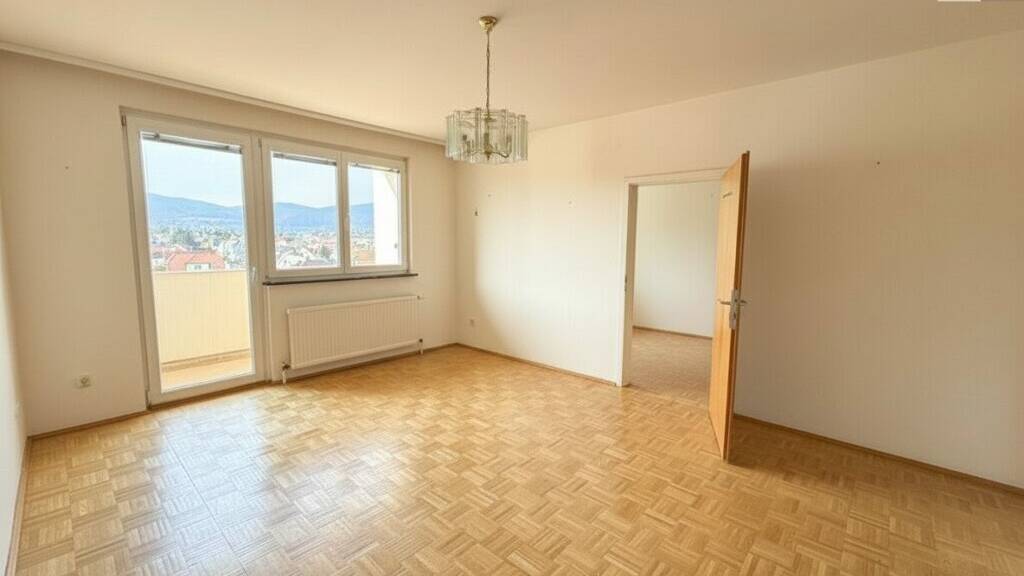 Rechterhand entlang des Flurs gelangt man in das helle und einladende Wohnzimmer mit direktem Zugang zur westseitigen Loggia. Diese bietet ideale Voraussetzungen für entspannte Abendstunden in der Sonne und eröffnet einen beeindruckenden Ausblick über ganz Baden - vom Mitterberg bis hin zum Schneeberg bei klarer Sicht.