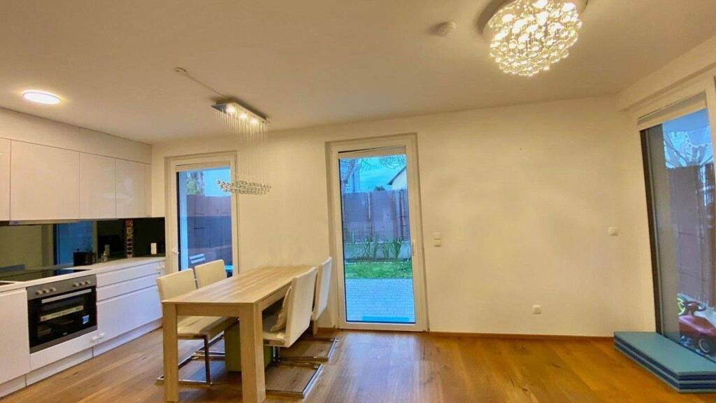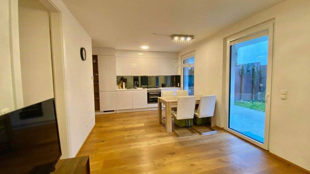 Die Wohnung zeichnet sich durch eine klare Raumstruktur und kurze Wege aus. Sowohl der Wohnbereich als auch das Schlafzimmer verfügen über einen direkten Zugang zur Terrasse und zum Garten, was den Wohnraum optisch und funktional erweitert.