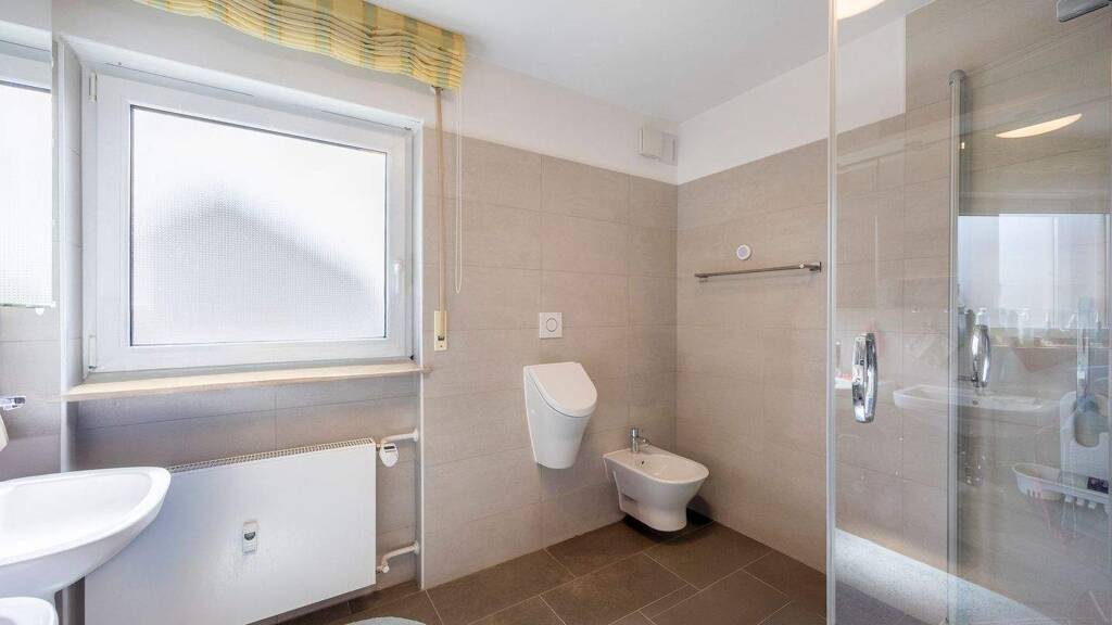 Von der Küche aus führt ein Durchgang in den angrenzenden Hobbyraum, der vielseitig nutzbar ist - ob als Fitnessbereich, Atelier oder Spielzimmer, hier findet jedes Bedürfnis seinen Raum. Vom Hobbyraum aus gelangt man in das moderne, neuwertige, behindertengerechte Badezimmer, das mit zwei Waschbecken, einer geräumigen Dusche, einem Urinal und einem Bidet bestens ausgestattet ist und hohen Komfort verspricht.
