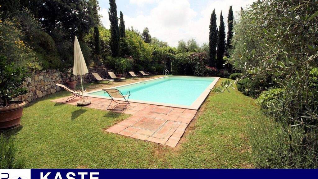 Die Villa steht in der Mitte des Grundstücks und ist komplett eingezäunt. Das Grundstück ist etwa 5000 qm groß. Die Villa ist von einem Park umgeben, der ca. 54.000 qm umfasst. Der sehr gepflegte Garten mit Blumen und Pflanzen sorgt für ein besonderes Flair. Außerdem gibt es einige Dutzend Olivenbäume, die genug Oliven für den Bedarf der Familie produzieren. In einem privaten Bereich in der Nähe der Villa gibt es einen schönen Swimmingpool von 11×5 m mit einer breiten Sonnenterrasse. Sie erreichen die Villa über eine von Bäumen umgebene Straße mit Zypressen und Hecken, die die Villa aufwerten. Die Villa ist 518 qm groß und besitzt 2 Etagen + 1 Keller. Das Erdgeschoss hat einen großzügigen Eingangsbereich, eine große Küche im Lucca-Stil mit Hauswirtschaftsraum, ein Esszimmer mit Zugang zur Terrasse, auf der Sie schöne Mahlzeiten im Freien mit Verwandten und Freunden genießen können, ein Wohnzimmer mit Kamin und Zugang zur Veranda. Eine Holztreppe führt in den ersten Stock, wo sich ein Badezimmer und die Schlafzimmer befinden. Außerdem befindet sich dort ein Hauptschlafzimmer mit begehbarem Kleiderschrank und Bad mit Jacuzzi und direktem Zugang zur Terrasse mit herrlichem Panoramablick, ein weiteres Schlafzimmer inklusive Bad, 2 weitere Schlafzimmer und ein weiteres Bad. Im Untergeschoss gibt es ein großes Wohnzimmer, einen Studioraum, eine Waschküche, einen Hauswirtschaftsraum und ein Badezimmer. Die Villa ist in perfektem Zustand und hat eine sehr gute Ausstattung.