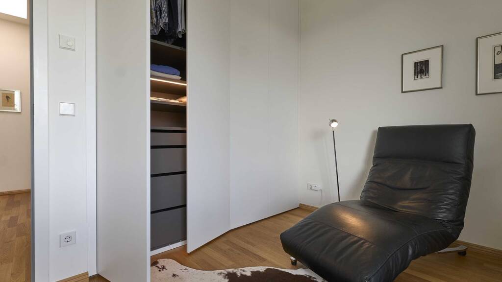 Zwei ruhige Schlafzimmer und ein charmantes Arbeitszimmer bilden den privaten Rückzugsbereich – alle drei öffnen sich zu sonnigen Terrassen mit Panoramaausblick nach Süden und Norden. Hochwertige Einbauschränke sorgen für großzügigen Stauraum, während ein Oberlicht im Flur selbst bei geschlossenen Türen für sanfte Tagesbeleuchtung sorgt.