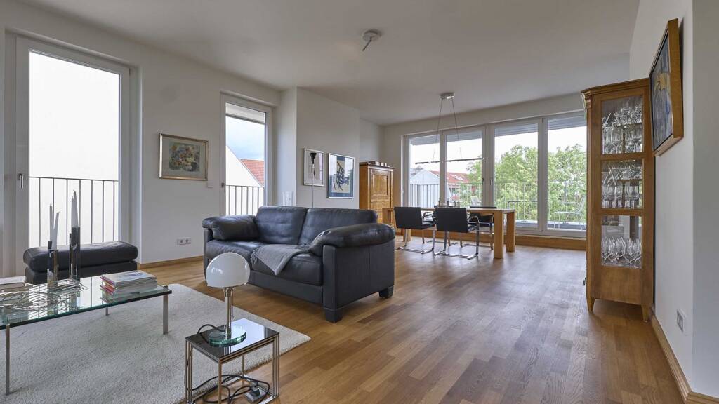 Die Penthousewohnung liegt im obersten Stockwerk eines dezent-eleganten Eckbaus aus den Jahren 2012/13 und besticht durch klare Linien, lichtdurchflutete Räume und einen atemberaubenden Rundumblick. Ein Aufzug führt Sie direkt in Ihr Refugium, in dem Fußbodenheizung in jedem Zimmer behagliche Wärme spendet.