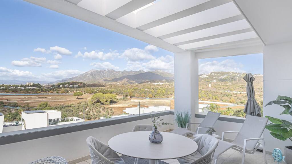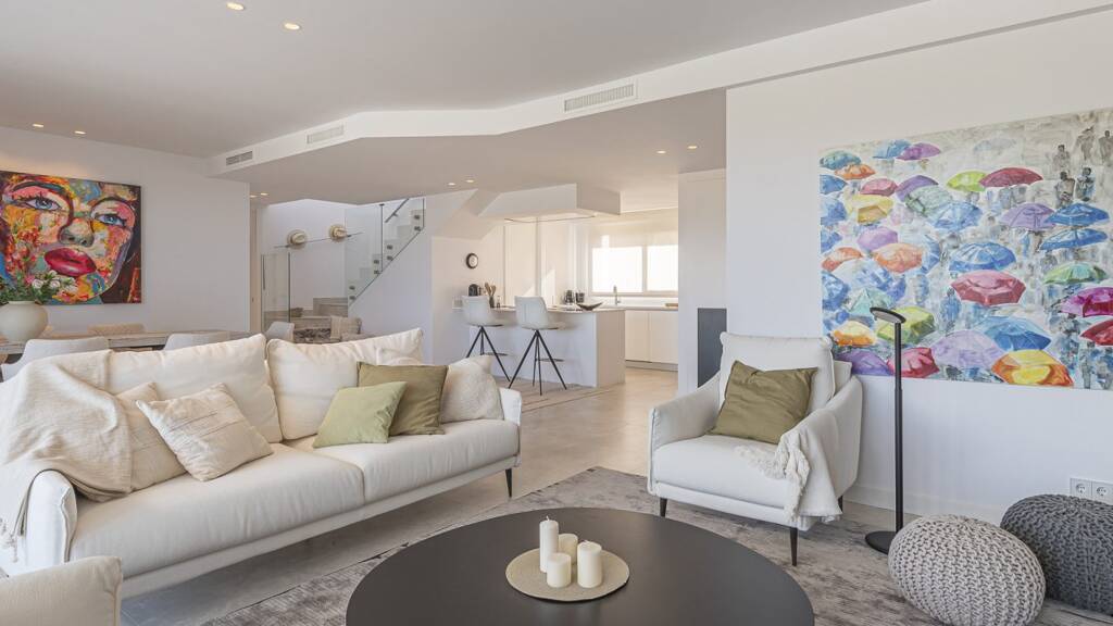 Diese luxuriöse Penthouse-Wohnung empfängt Sie mit einem lichtdurchfluteten Salon, einer hochwertigen offenen Einbauküche samt Hauswirtschaftsraum und einer vorgelagerten, teilweise überdachten Terrasse mit Panorama Meerblick, den Golfplatz und die Berge der Umgebung.