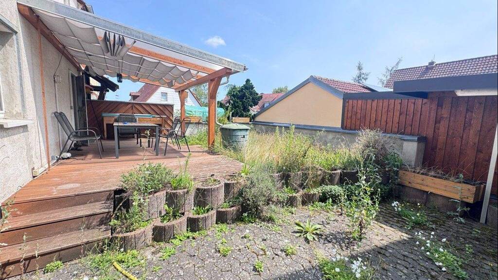 Das Haus verfügt über einen ausgebauten Dachboden, der zusätzliche Nutzfläche oder mögliche weitere Wohnfläche bietet. Der eigene Garten mit überdachter Terrasse lädt zum Verweilen ein und bietet Raum für individuelle Gestaltungsmöglichkeiten. Auf dem 395 m² großen Grundstück stehen außerdem zwei Garagenstellplätze zur Verfügung.