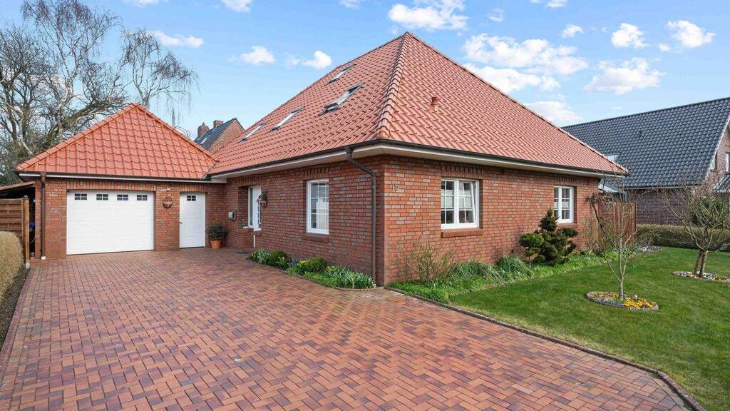 Dieser moderne Bungalow aus dem Jahr 2005 überzeugt mit einer großzügigen Wohnfläche von ca. 176 m² sowie zusätzlichen ca. 41 m² Nutzfläche und bietet komfortables Wohnen mit durchdachter Raumaufteilung. Das ca. 600 m² große Grundstück ist vollständig eingefriedet, pflegeleicht angelegt und mit Obstbäumen bepflanzt - eine grüne Oase mit angenehmer Privatsphäre. Im Erdgeschoss erwartet Sie ein helles Wohnzimmer mit direktem Zugang zur Terrasse. Ein Kaminofen mit hochwertiger Granit- und Marmorverkleidung sorgt hier für eine behagliche Atmosphäre. Der im Jahr 2025 neu verlegte Vinylboden unterstreicht den modernen Charakter des Raumes. Die Küche ist mit Geschirrspüler, Cerankochfeld und Backofen ausgestattet und verfügt zudem über einen Fernsehanschluss. Ein praktischer Abstell- bzw. Vorratsraum mit Lüftung bietet zusätzlichen Stauraum. Das Schlafzimmer im Erdgeschoss ist mit Laminatboden versehen und bietet einen ruhigen Rückzugsort. Das großzügige Badezimmer überzeugt mit Badewanne, einem großen ebenerdigen Duschbereich mit Wellnessduscharmatur, Handtuchheizung, WC und Bidet - ideal für komfortables Wohnen. Ergänzt wird das Raumangebot durch einen Hauswirtschaftsraum mit Anschlüssen für Waschmaschine und Trockner, der Heizungsanlage sowie einem direkten Zugang in den Garten. Im Dachgeschoss eröffnet ein offener Flur vielseitige Nutzungsmöglichkeiten. Zwei Zimmer mit Laminatboden stehen zur freien Gestaltung bereit. Ein weiteres Zimmer verfügt ebenfalls über Laminat und bietet die Möglichkeit, eine zusätzliche Küche zu integrieren, da entsprechende Anschlüsse bereits in der Wand vorbereitet sind. Ein weiteres Badezimmer mit Dusche, WC, Fußbodenerwärmung und Waschmaschinenanschluss sorgt für zusätzlichen Komfort auf dieser Ebene. Der Außenbereich punktet mit einer überdachten Terrasse in attraktiver Südwest-Lage - ideal für sonnige Nachmittage und entspannte Abende im Freien. Eine Garage mit elektrischem Rolltor rundet das Angebot ab. Zur weiteren Ausstattung zählen eine Fußbodenheizung im Erdgeschoss (mit Ausnahme des Schlafzimmers), ein vorhandener Glasfaseranschluss sowie eine Grundwasserbohrung zur kostensparenden Gartenbewässerung. Die Übergabe der Immobilie ist kurzfristig möglich. Insgesamt handelt es sich um einen gepflegten und großzügigen Bungalow mit flexiblen Nutzungsmöglichkeiten.