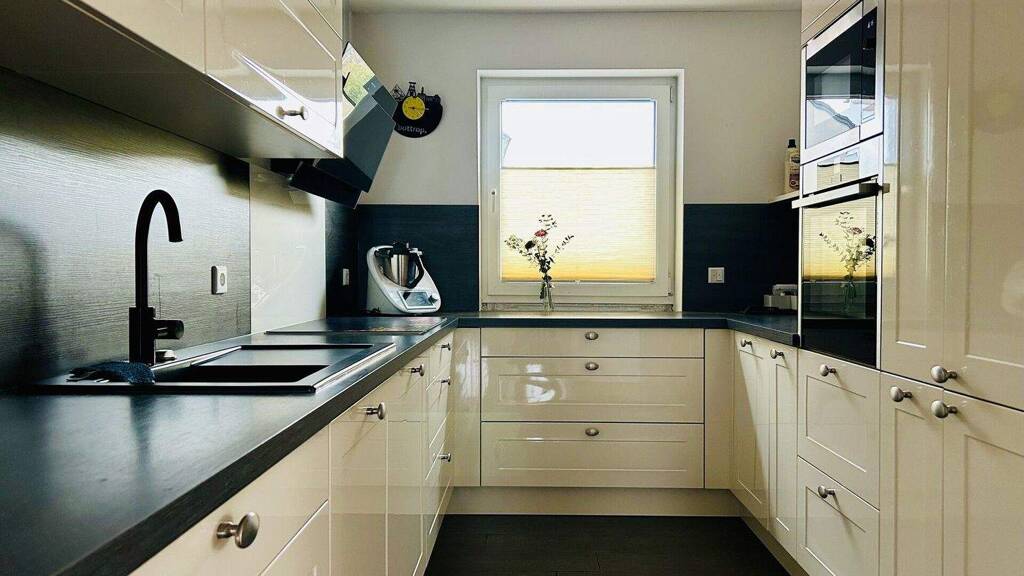 Das Badezimmer wurde im Jahr 2022 modernisiert und verfügt über eine neue Dusche sowie eine Badewanne. Die offen gestaltete Küche ist mit einer hochwertigen Einbauküche ausgestattet und fügt sich harmonisch in den Wohnbereich ein.