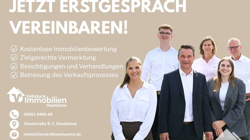 Sämtliche Fotos, Texte und grafische Darstellungen (Grundrisse, Visualisierungen) sind Eigentum der Volksbank Haselünne eG und dürfen nicht von Dritten verwendet oder weitergegeben werden. Alle angegebenen Daten stammen von unserem Auftraggeber. Für die Richtigkeit und Vollständigkeit können wir trotz größter Sorgfalt keine Gewähr übernehmen. Die aufgeführten Pläne (z. B. Grundrisszeichnungen, Ansichten, Schnittzeichnungen) und Berechnungen dienen der der genaueren Übersicht, diesbezüglich besteht kein Anspruch auf Genauigkeit.