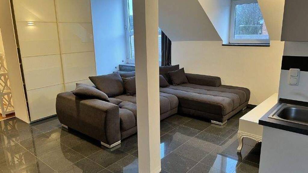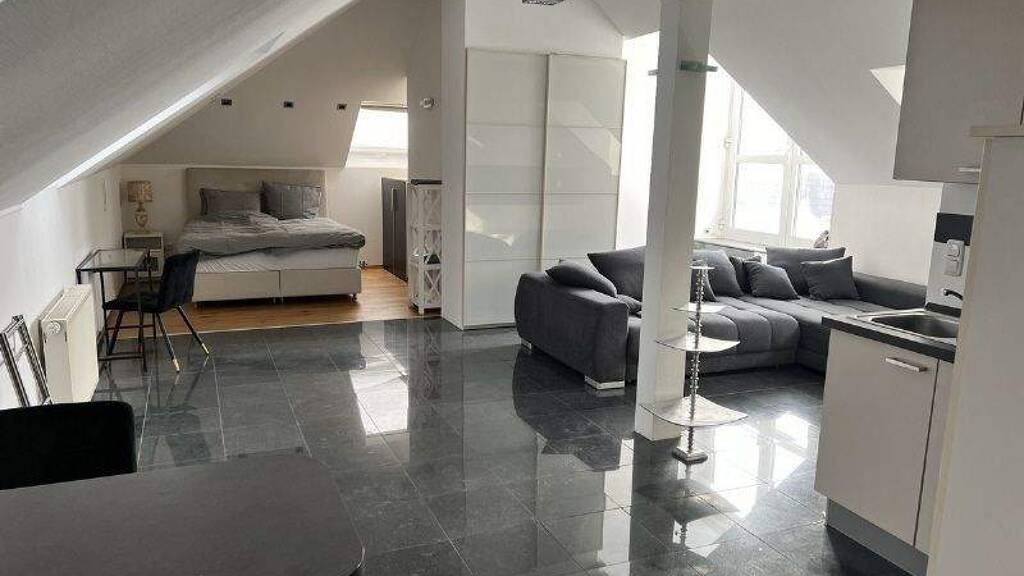 Wohnen wie im Loft... Diese modern möblierte 1,5 Zimmerwohnung im 2. Geschoß eines gepflegten Hauses vermittelt beim Eintreten sofort Großzügigkeit. Der fließende Übergang der einzelnen Wohnbereiche, die sich im Raum verteilen, lässt keinerlei Gefühl der Enge aufkommen. Über den offenen Eingangsbereich erreicht man zuerst die gut ausgestattete Küche und den kleinen Essplatz. Der Raum erweitert sich zum Sitzbereich mit der L-förmigen Couch. Dahinter befindet sich mit den großen Fenstertüren der Zugang zur riesigen Terrasse. Diese lädt an den warmen und trockenen Tagen zum Verweilen ein und erhöht den Erholungswert, nach anstrengenden Arbeitstagen. Am Ende des langgestreckten Raumes liegt der Schlafbereich mit gemütlichem Doppelbett. Das mit edlen schwarzen Fliesen ausgestattete Duschbad vervollständigt diese besondere Wohnung.