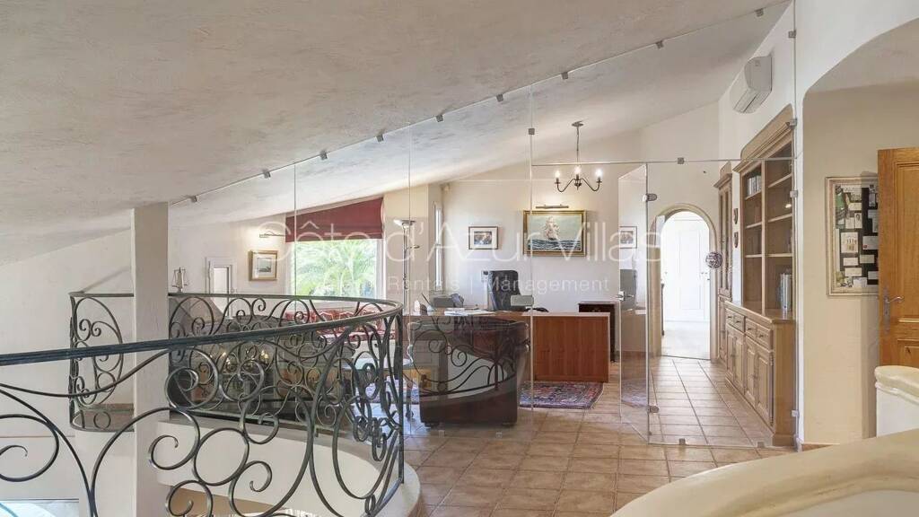 1. Obergeschoss: Eine prächtige Elternsuite mit Panoramablick aufs Meer und die Hügel, mit Bad, Dusche, Ankleidezimmer und eigenem WC. Ein großzügiges Büro im Mezzanin bietet einen inspirierenden Arbeitsbereich mit Blick auf die Gärten, den Pool und das Meer. Ein zweites Schlafzimmer mit Bad vervollständigt diese Ebene.