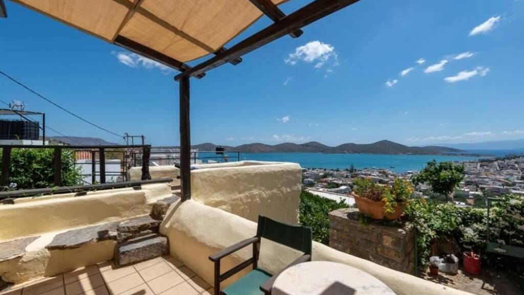 Im Außenbereich gibt es eine große Terrasse mit herrlichem Blick auf das Dorf und das Meer von Elounda. Es verfügt über eine schattige Pergola (direkt vor dem Schlafzimmer), einen schönen Bereich zum Sonnenbaden und eine Seitenterrasse, die zu einem dritten separaten Schlafzimmer mit Etagenbett und Fenster führt.