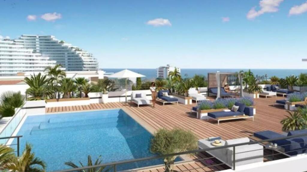 Die Wohnung bietet: 1 Eingang 1 Küche, offen zum Wohnzimmerbereich 2 Schlafzimmer 1 Duschbad Terrasse vor der Wohnung und kleiner Gartenteil Aufzug im Haus Pool auf dem Dach Neue High-End-Einbauküche