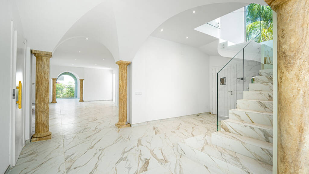 Tucked away in the exclusive beachside area of Los Monteros in Marbella East, just a short walk from the beach, this villa is truly one of a kind. Inspired by Venetian church architecture, it combines timeless European elegance with relaxed coastal living. Set on a generous 933 square metre plot, the four-bedroom, four-bathroom home-including two en-suites-is spread across three levels, offering a unique blend of style, comfort, and space. A grand entrance welcomes you with elegant pillars, arched doorways, and polished marble floors that run throughout the house, setting the tone for what's to come.