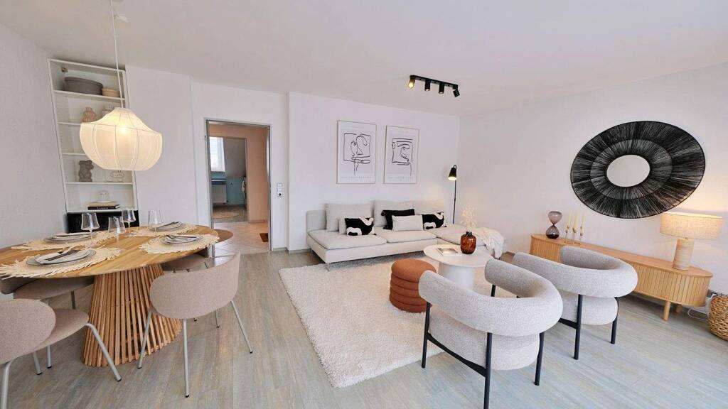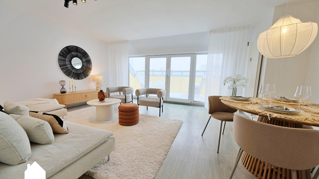 Das großzügige Wohn- und Esszimmer bildet das Herzstück der Wohnung. Große Fensterflächen lassen viel Tageslicht hinein und schaffen eine freundliche, einladende Atmosphäre. Von hier aus gelangt man direkt auf die Loggia mit elektrischer Markise - ein Lieblingsplatz für sonnige Frühstücke oder laue Sommerabende.
