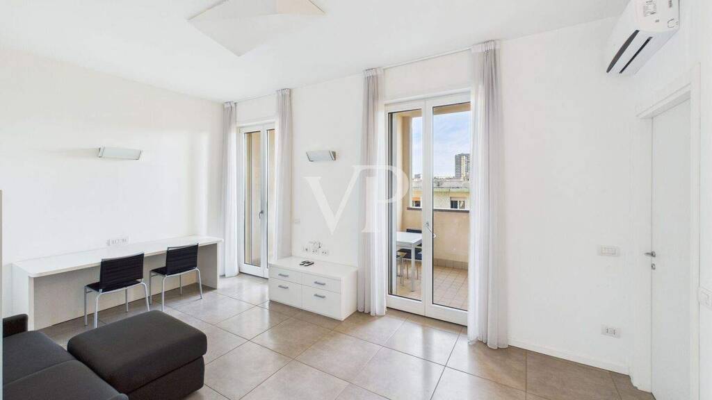 Der Eingang führt in einen großen Wohnbereich mit Küchenzeile, der sich durch moderne Linien und einen großzügigen Blick auf den Balkon auszeichnet, der zum Entspannen im Freien einlädt. Der Schlafbereich umfasst ein großes Schlafzimmer mit Doppelbett: Derzeit gibt es eine bewegliche Holzwand, die vom jetzigen Eigentümer geschaffen wurde, um zwei getrennte Bereiche zu schaffen, eine Lösung, die leicht entfernt werden kann, um die ursprüngliche Umgebung wiederherzustellen.