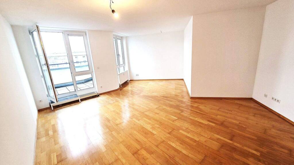 Die außergewöhnlich geschnittene, helle Wohnung befindet sich im 4. Stock - oberste Etage - einer im Jahr 2000 fertiggestellten Wohnanlage. Sie besteht aus einem großzügigen Wohnzimmer mit Zugang zu der Dachterrasse (ca. 5,8m²), einem Schlafzimmer, einem Kinderzimmer und einer geräumigen Wohnküche. Die Einbauküche mit Elektrogeräten ist im Kaufpreis beinhaltet. Ein Bad mit Badewanne und ein separates Gäste WC sind vorhanden. Von der Terrasse und den Zimmern hat man einen schönen Blick auf den begrünten Innenhof und ist von der anliegenden Straße - 30er Zone - sehr gut abgeschirmt. Die Wohnung verfügt über ein Kellerabteil und einen Duplex-Stellplatz. Die Tiefgarage wurde erst vor kurzem saniert. In der Wohnanlage stehen Abstellplätze für Kinderwagen und Fahrräder, sowie Wasch - und Trockenraum zur Verfügung. Die Wohnung ist zur Zeit nicht vermietet.