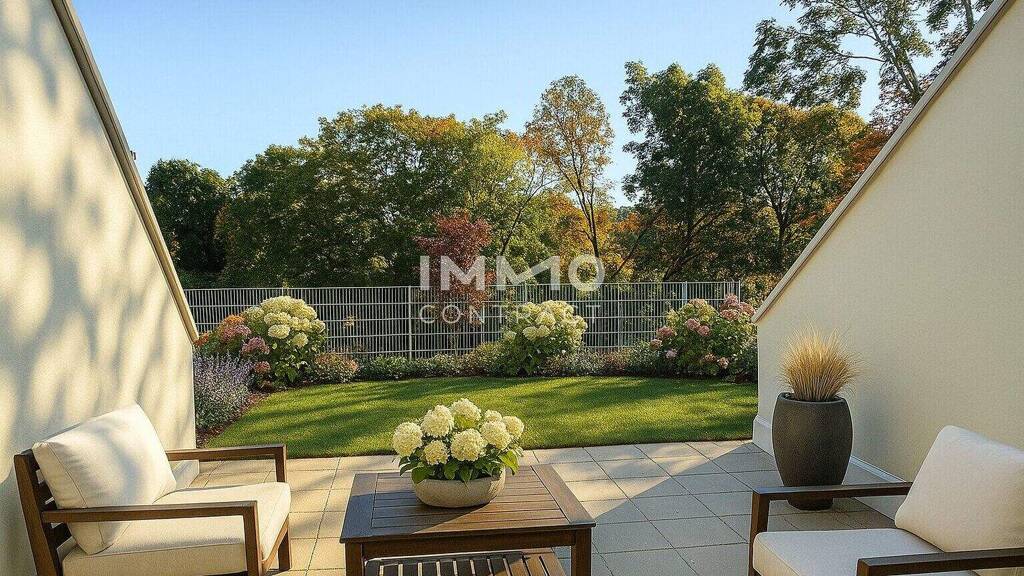 TRAUM TOWNHOUSE ! Vom Eingang geht es vom Vorraum mit Gäste WC in ein gemütliches Wohnesszimmer mit Terrasse die über den eigenen Garten und in die Bäume der Gartenebene blickt . Ein Schlafzimmer mit Duschbad ist auch auf diese Terrasse orientiert. Eine Treppe führt von der Terrasse in den eigenen Garten. Zusätzlich befindet sich auf der anderen Seite der Gartenebene ein Gemeinschaftsgarten mit Spielplatz. Auf der Gartenebene liegen auch das zweite und dritte Schlafzimmer mit eigenem Badezimmer mit Badewanne und separatem WC. Vor den Schlafzimmern lädt eine weitere Terrasse zum Verweilen ein.
