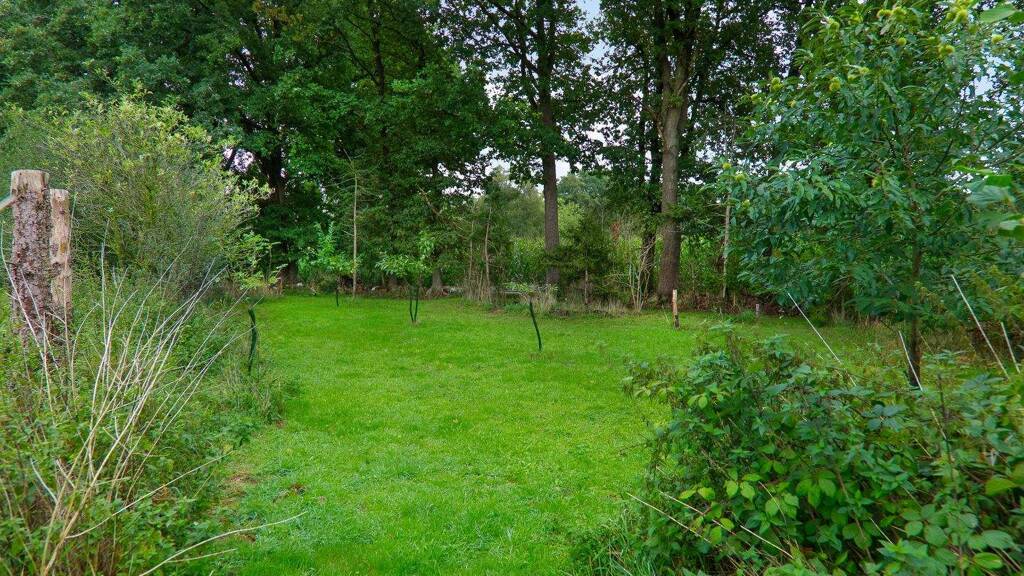 Auf der Rückseite geht das Grundstück fließend in eine waldreiche Landschaft über – mit einer beeindruckenden Vielfalt an Bäumen und Vegetation. Ein Paradies für Naturliebhaber.