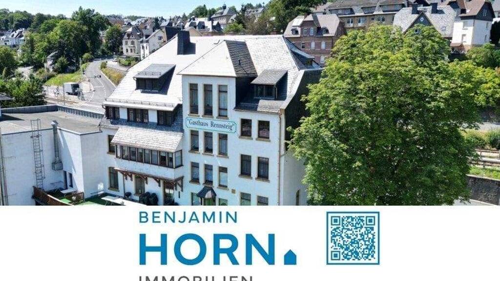 Das 1901 erbaute Gebäude wurde 1993 saniert und in ein Hotel umgebaut. Das Haus verfügt in zwei Gasträumen über 100 Plätze und auf der Terrasse mit Saaleblick stehen nochmals 50 Plätze zur Verfügung. Die voll ausgestattete Küche und die gesamte Betriebs- und Geschäftsausstattung inklusive Zimmereinrichtungen werden mit verkauft.
