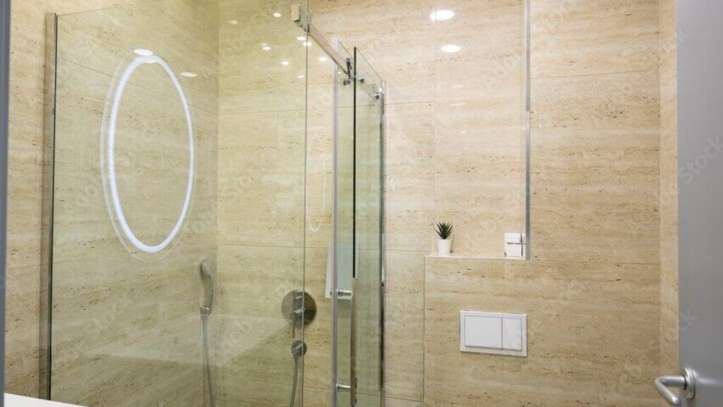 * Feinsteinzeug- Bodenbelag (30x 60 cm) in den Sanitärräumen
