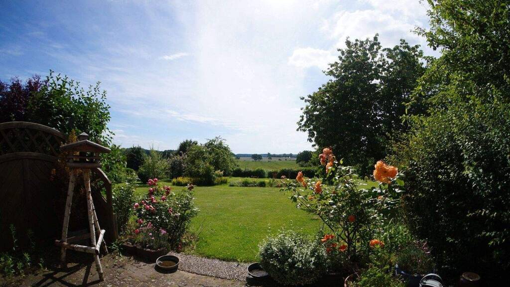 Das große Grundstück bietet einen schön angelegten Garten, den man von der Terrasse überblicken kann.