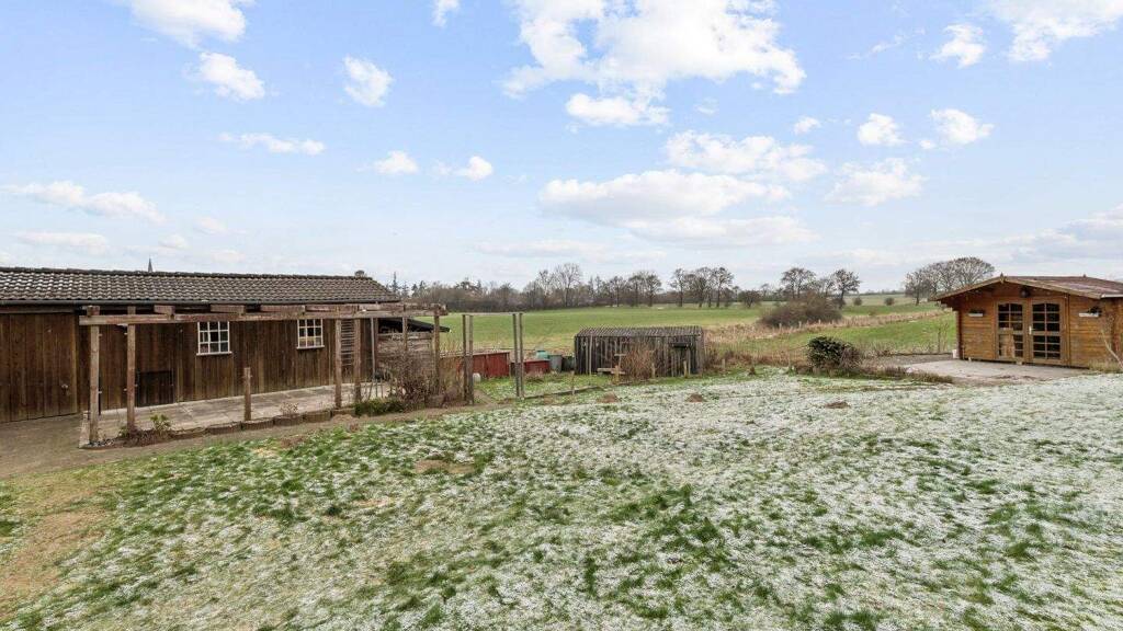 Das Herz des Hauses bildet der helle, weitläufige Wohnbereich mit gemütlichem Kaminofen. Hier treffen sich Familie und Freunde an kühlen Abenden, während das Feuer leise knistert. Große Türen öffnen sich zur sonnigen Terrasse und in den Garten - perfekt für gemeinsame Mahlzeiten im Freien oder entspannte Nachmittage im Grünen. Ein liebevoll gestalteter Anbau aus dem Jahr ca. 2004 mit großzügigem Panoramafenster schenkt einen traumhaften Blick über die Felder und Wälder des Dänischen Wohlds und lässt die Natur Teil des Wohnraums werden. Die funktionale Einbauküche grenzt direkt an einen separaten Vorratsraum mit Zugang zum Keller und bietet praktischen Stauraum für den Familienalltag. Der Dachgeschossausbau erfolgte ca. 1994 inklusive neuem Dach und Dämmung und erweitert das Haus um behagliche Rückzugsorte.