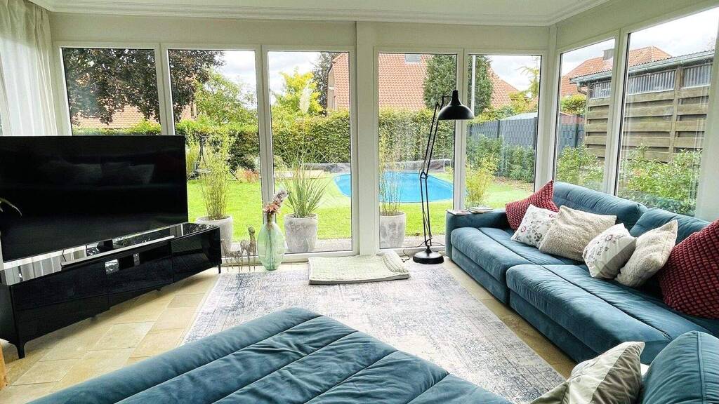 Licht, Luft und ein Garten, der den Alltag nach draußen verlagert, prägen den ersten Eindruck dieses Einfamilienhauses in Laer im Münsterland. Im direkten Umfeld lassen sich die Wege des täglichen Lebens in der Regel gut organisieren, mit Angeboten wie Einkaufsmöglichkeiten, Kindergarten und Schule sowie Anbindungen an den öffentlichen Verkehr, was gerade im Familienalltag spürbar entlasten kann.