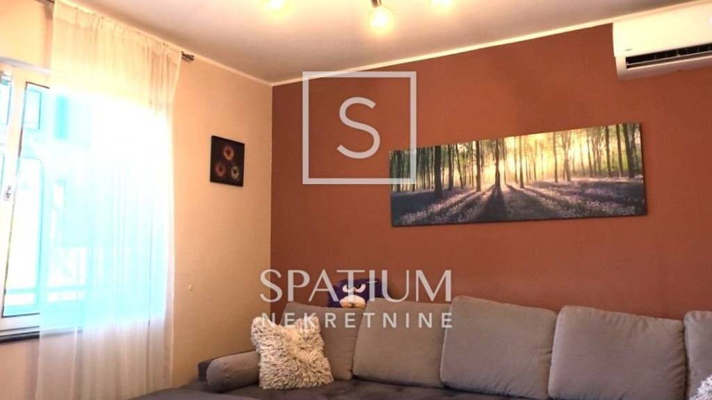Die Wohnung ist mit zwei Klimageräten ausgestattet, verfügt über eine eigene Heizung und PVC-Fenster mit hervorragender Schallisolierung. Sie besteht aus Wohnzimmer, Küche, Flur, zwei Schlafzimmern, Bad und separatem WC. Die Balkone sind mit Schiebetüren aus Glas geschlossen. Zur Wohnung gehören eine Garage von 13,80 m² und ein Abstellraum, beide im Grundbuch eingetragen.