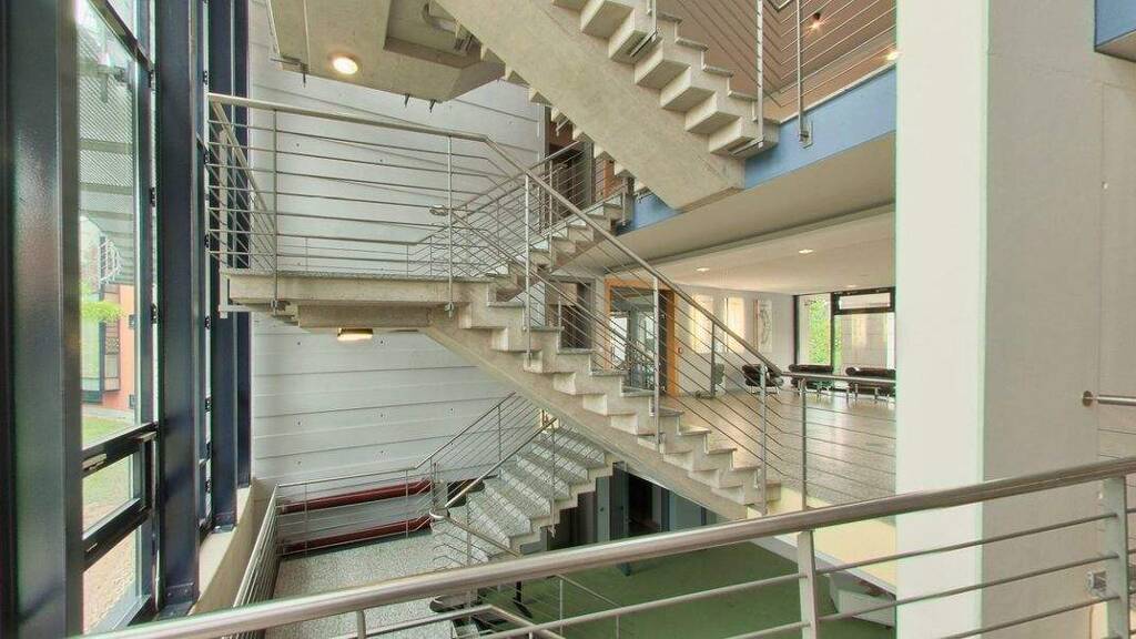 - Baujahr 1995 - Gewerbeimmobilie als Bürogebäude mit Renditeausrichtung - Unterkellerung vorhanden - Repräsentativer Eingangsbereich mit großflächiger Verglasung - Automatische Drehtür im Eingangsbereich - Großzügiges, offenes Treppenhaus mit Sichtbetontreppe - Treppenhaus mit Metallgeländern - Büroflächen mit großformatigen Fensterbändern für gute Tageslichtversorgung - Teilweise bodentiefe bzw. sehr großflächige Verglasung in den Bürobereichen - Heizkörper in den Büroflächen sichtbar installiert - Bodenbeläge Büroflächen überwiegend in Holzoptik Laminat - Bodenbelag Eingangsbereich und Verkehrsflächen in Stein oder Natursteinoptik - Abgehängte Decken mit integrierten Rasterleuchten in den Büroflächen - Akustikdecke mit Lochung im Eingangsbereich - Sichtbetonstützen in den Büroflächen - Innenwände überwiegend glatt, hell gehalten - Teilweise Glaselemente und Glastüren im Innenbereich - Außenanlage mit befestigten Verkehrsflächen und Zufahrt - Stellplatzflächen im Außenbereich vorhanden - Gebäudeaußenansicht mit moderner, geschwungener Fassadengestaltung - Teilweise überdachte Bereiche im Außenbereich - Kellerfenster im Sockelbereich sichtbar