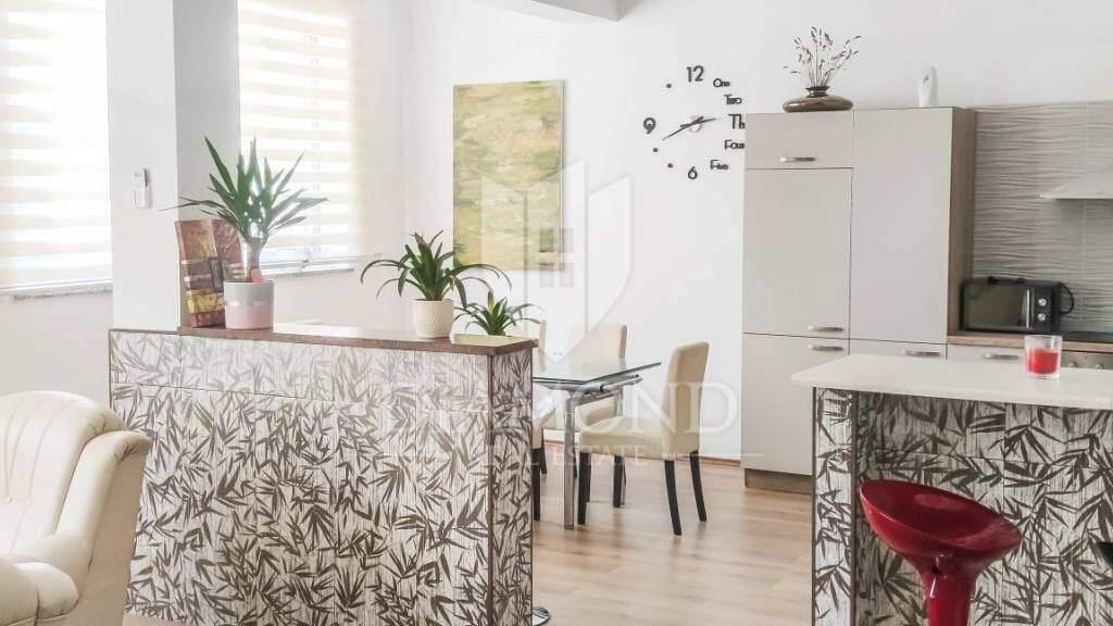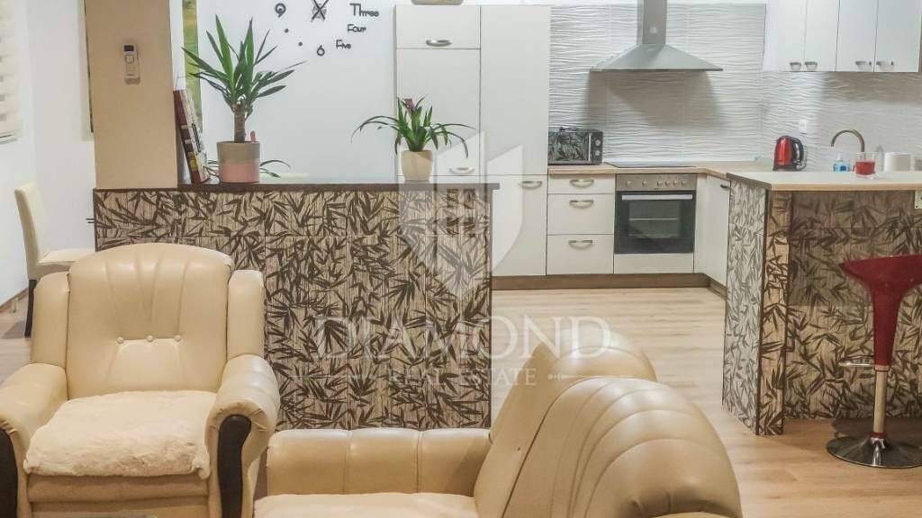 Die Wohnung befindet sich im Erdgeschoss eines kleineren Wohnhauses mit nur drei Wohnungen. Die Wohnung besteht aus einem Flur, einem Wohnzimmer, einer Küche mit Esszimmer, einer Toilette, einem Badezimmer und zwei Schlafzimmern, wodurch die Gesamtfläche der Wohnung 100 m2 beträgt. Das Gebäude verfügt über eigene Parkplätze für Mieter sowie eine Gemeinschaftsterrasse mit Kamin, die Raum zum Entspannen und geselligen Beisammensein bietet. Diese Wohnung vermittelt ein Gefühl von Privatsphäre und Exklusivität, da sie sich das Gebäude nur mit zwei anderen benachbarten Wohnungen teilt. Die Wohnung wurde im Jahr 2022 komplett renoviert.