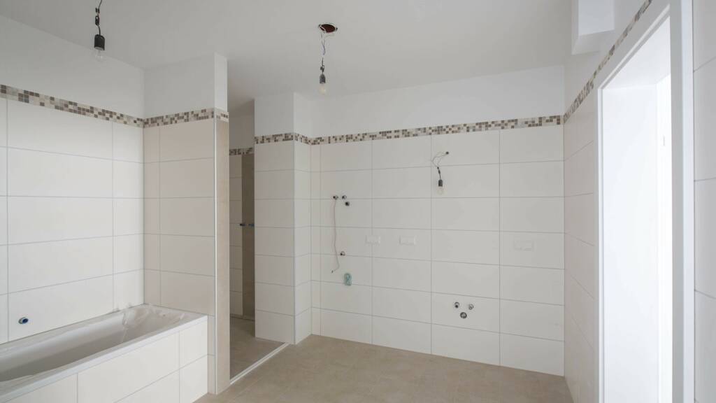 Großes Bad mit Wanne/Dusche/WC (ca. 10 m²) plus extra WC mit Handwaschbecken.