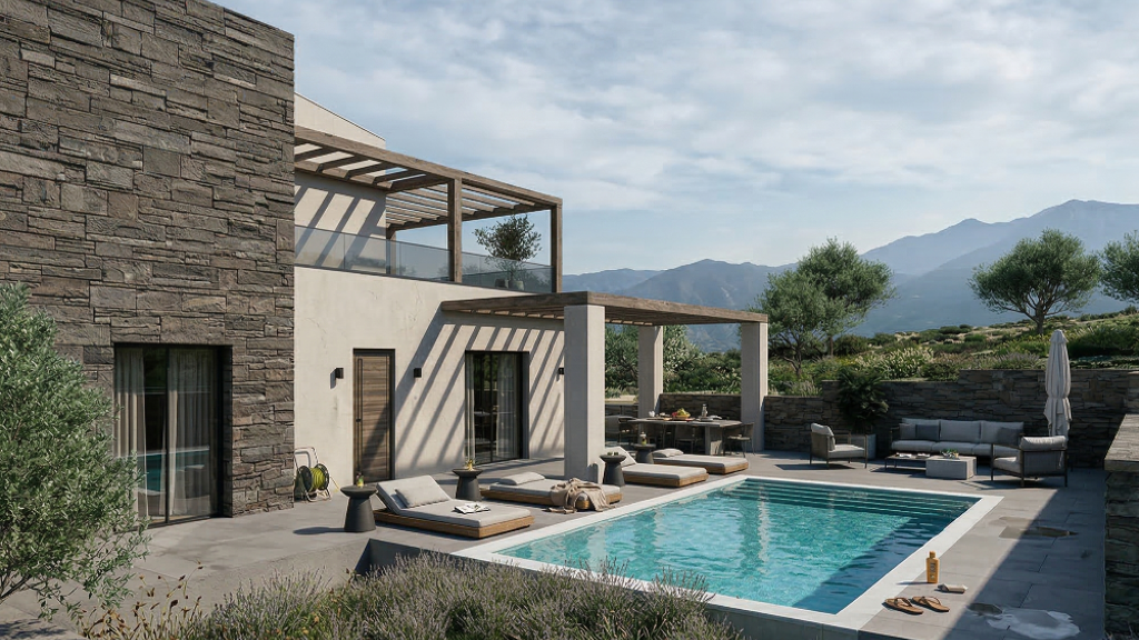 Dieses sorgfältig geplante Projekt vereint zeitgenössische Architektur mit dem zeitlosen Charme von Naturstein und schafft so Häuser mit starker Identität, eleganten Proportionen und einer harmonischen Einbettung in die kretische Landschaft. Jede Residenz erstreckt sich über zwei Ebenen und bietet drei Schlafzimmer, zwei Badezimmer sowie einen hellen, offenen Wohn- und Küchenbereich. Darüber hinaus verfügt jedes Haus über einen eigenen Swimmingpool , Terrassen, Pergolen und wunderschön gestaltete Außenbereiche.