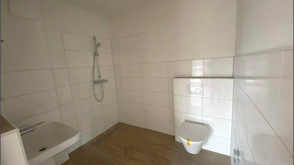 Angrenzend befindet sich ein praktischer Abstellraum mit Waschmaschinenanschluss, ideal für zusätzlichen Stauraum. Das moderne Badezimmer ist mit Waschbecken, WC sowie einer ebenerdigen Dusche mit Ablaufrinne ausgestattet.