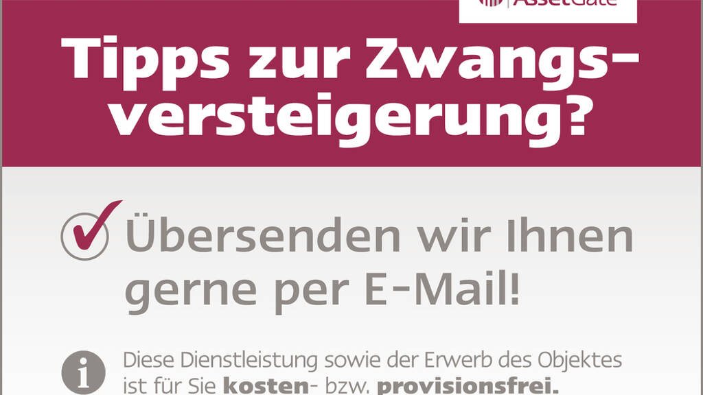 Die Immobilie kann leider nur über die Zwangsversteigerung erworben werden. Auch können wir Ihnen z.Z. keine Besichtigungstermine anbieten. Der von uns beworbene Preis entspricht nur 70% des Verkehrswerts und ist im Versteigerungstermin voraussichtlich zuschlagsfähig. Alle Fragen zum Versteigerungsverfahren werden von uns beantwortet. Dieser Service ist für Sie kostenfrei, das Objektangebot für Sie provisionsfrei.