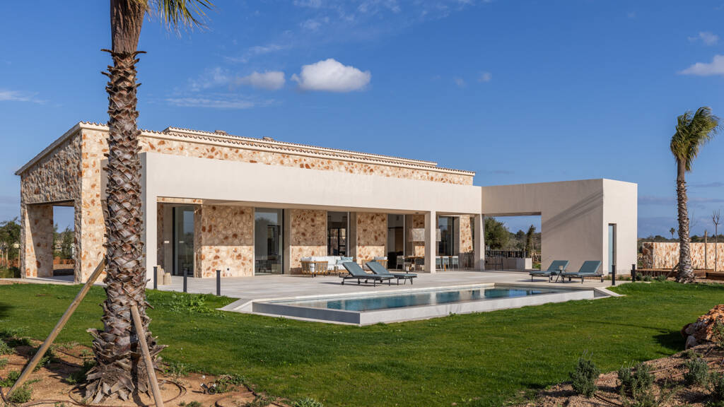 Moderne Neubaufinca mit Natursteinmauern und Pool in Traumlage bei Cala Llombards