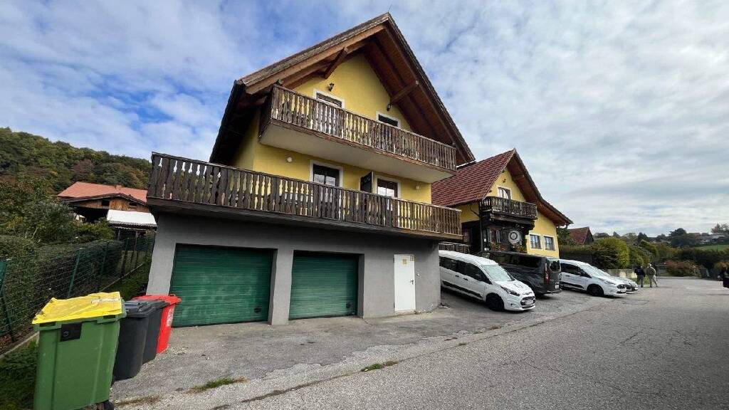 Aktuell wird das Haus als Kombination aus Büro- und Mitarbeiterwohnen genutzt, mit klar gegliederten Bereichen: Im Erdgeschoss liegen Aufenthaltsraum, Küche, zwei Gästezimmer mit Sanitär, mehrere Lagerräume sowie Büroräume für drei Arbeitsplätze und getrennte Sanitäranlagen. Das Obergeschoss umfasst zwölf weitere Gästezimmer, jeweils mit eigenen Badezimmern. Ein Keller mit rund 100 m² ergänzt die Nutzfläche; am Grundstück stehen bis zu 12 Pkw-Stellplätze zur Verfügung. Beheizt wird über Öl, die Warmwasserbereitung wird durch eine Solaranlage unterstützt.