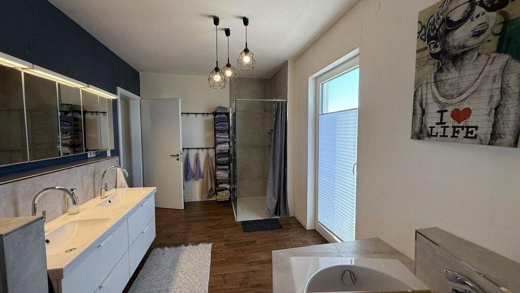 Im Dachgeschoss befinden sich weitere drei Zimmer, die als Schlafzimmer und Kinderzimmer individuell genutzt werden könnten. Ein komfortables Bad mit viel Platz und moderner Ausstattung wartet ebenfalls dort auf Sie. Die Eigentümer haben im Jahr 2024 alle Bodenbeläge erneuert und das Haus im Innenbereich gestrichen.