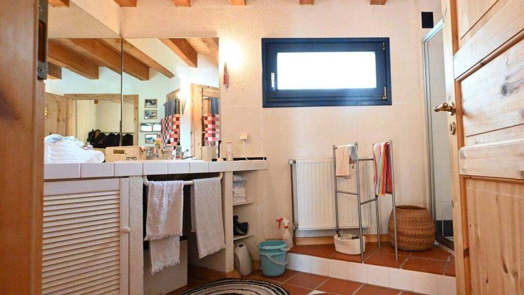 Dieses Haus am Stockweiher verbindet eleganten Wohnkomfort mit naturnaher Lage. Vom Eingang aus betreten Sie einen einladenden Flur, der als zentrale Erschließung dient und gleich mehrere funktionale Bereiche miteinander verbindet. Rechts liegt das Badezimmer, modern gestaltet mit hellen Oberflächen, zeitloser Sanitärausstattung und ausreichendem Tageslicht. Das Badezimmer bietet Platz für eine Dusche, Waschbecken und WC - ein freundlicher Rückzugsort für Erholung nach einem Tag am Wasser.