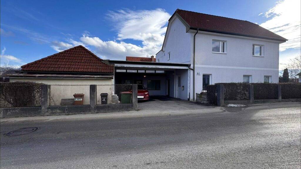Ergänzt wird der Gewerbebereich durch zwei Garagen sowie einen überdachten Vorplatz, der sich ideal als Kfz-Unterstellmöglichkeit oder für Lade- und Liefertätigkeiten eignet.