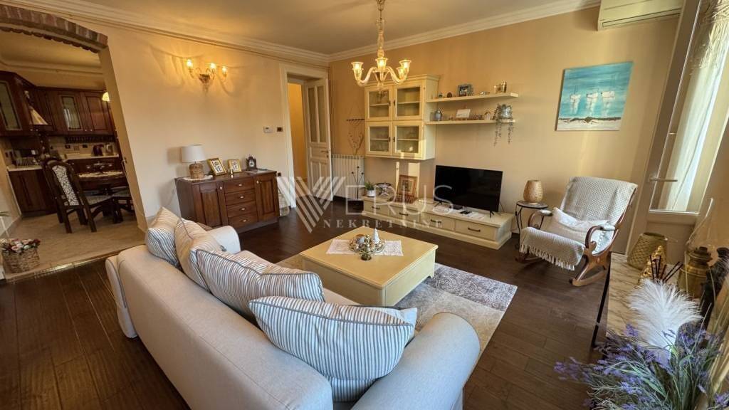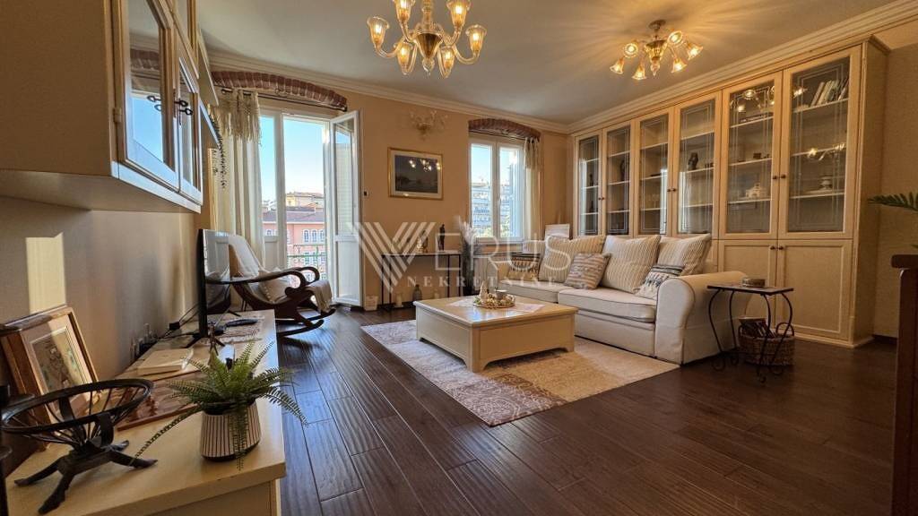 Zum Verkauf steht eine schöne und geräumige Wohnung von 105 m², die sich im vierten Stock eines historischen Rijeka-Bauernhofsgebäudes mit hohen Decken und großen Fenstern befindet, die eine besondere, authentische Atmosphäre des Charmes der Altstadt schaffen. Dieses elegante Anwesen strahlt einen mediterranen Stil und eine Kombination aus klassischer Architektur und moderner Dekoration aus und bietet ein außergewöhnliches Gefühl von Wärme und Komfort.