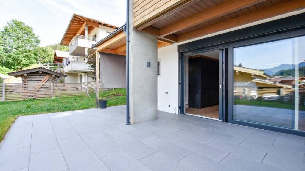 Die Gartenterrasse samt Grünfläche ist vom Untergeschoss aus erreichbar. Die überdachte Terrasse bietet erweiterten Wohnraum und lädt zu gemütlichen, entspannten Stunden zum Zurücklehnen ein. Der architektonische Stil des Wohnhauses wurde auch im Freien fortgeführt, sodass ein harmonisches Gesamtbild entstanden ist.