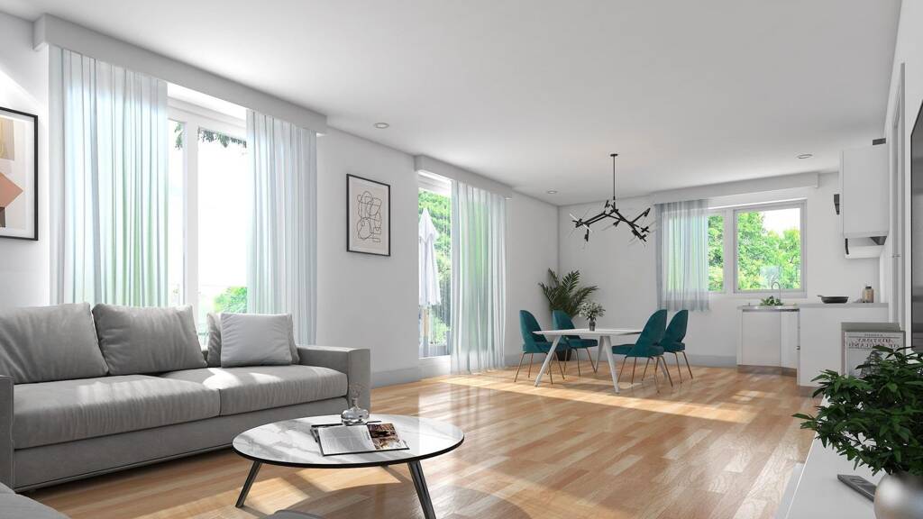 Die Wohnungen im Erd- und Obergeschoss sind mit einem großzügigen Wohn-Esszimmer mit offener Küche, zwei Schlafzimmern, einem Badezimmer und einem Abstellraum ausgestattet.