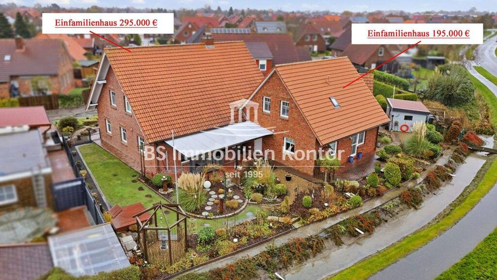 Das Einfamilienhaus wurde im Jahr 2010 in konventioneller Massivbauweise mit Satteldach errichtet. Das benachbarte Einfamilienhaus (siehe Luftbilder) kann ebenfalls auf Wunsch mit erworben werden. Beide Häuser verfügen über separate Eingänge und über getrennte Versorgungsanschlüsse für Gas, Wasser und Strom. Die weißen Kunststofffenster dreifachverglast und mit Jalousien ausgestattet. Beheizt wird die Immobilie durch eine Gas-Z.-Heizung. Die Gartenanlage ist pflegeleicht angelegt und mit verschiedenen Pflanzen gestaltet. Ein Blockhaus mit einer Größe von etwa vier mal drei Metern bietet zusätzlichen Stauraum. Der Gartenbereich eröffnet einen freien Blick über umliegende Wiesen und Weiden und schafft damit eine besonders angenehme Wohnatmosphäre. Zur Unterbringung des Fahrzeuges dient ein PKW-Einstellplatz. Darüber hinaus verfügt die Immobilie über einen modernen Glasfaseranschluss. Pewsum zeichnet sich durch eine ausgewogene Infrastruktur aus und bietet zahlreiche Ärzte sowie diverse Einkaufsmöglichkeiten für den täglichen Bedarf. Hervorzuheben sind der gepflegte Allgemeinzustand sowie die attraktive, ruhige und dennoch zentrale Wohnlage, die dieses Angebot besonders reizvoll machen.