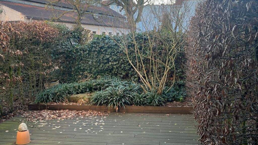 Der Gartenbereich bietet zusätzlichen Wohnkomfort: Der Eigentümer hat eine Holzterrasse mit integrierter Halterung für einen Sonnenschirm gebaut. Der Sonnenschirm sowie ein maßangefertigter Wohnzimmerschrank können auf Wunsch kostenfrei übernommen werden.