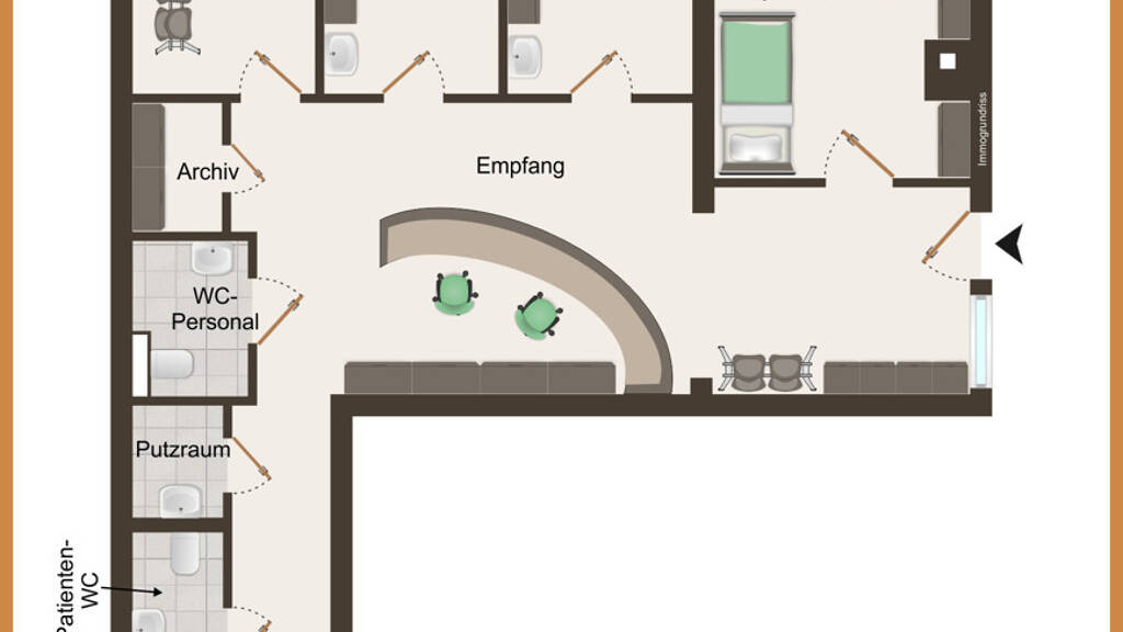 Im Erdgeschoss befinden sich drei attraktive Gewerbeeinheiten, darunter eine etablierte Arztpraxis mit einer Nutzfläche von 131 m². Die hohen Räume der Praxis schaffen eine einladende und helle Atmosphäre, die sowohl Mitarbeiter als auch Patienten begeistert. Die modernen und lichtdurchfluteten Räumlichkeiten sind optimal auf die Bedürfnisse einer Arztpraxis abgestimmt, wodurch sie sich großer Beliebtheit erfreut und durchgehend voll belegt ist.