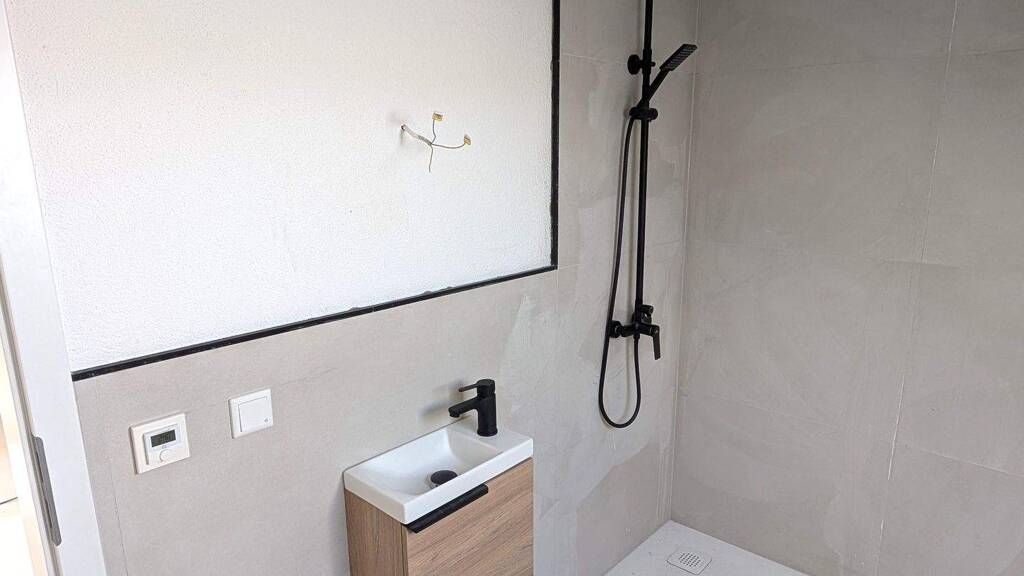 Insgesamt drei hochwertig ausgestattete Bäder mit WC und bodengleichen Duschen unterstreichen den hohen Anspruch an Komfort und Funktionalität. Ein besonderes Detail findet sich im Hauptbad des Obergeschosses: Eine elegant im Möbeldesign integrierte, versteckte Wäscheluke führt direkt in den Technikraum im Erdgeschoss, wo Waschmaschine und Trockner komfortabel angeschlossen sind - durchdacht bis ins Detail.